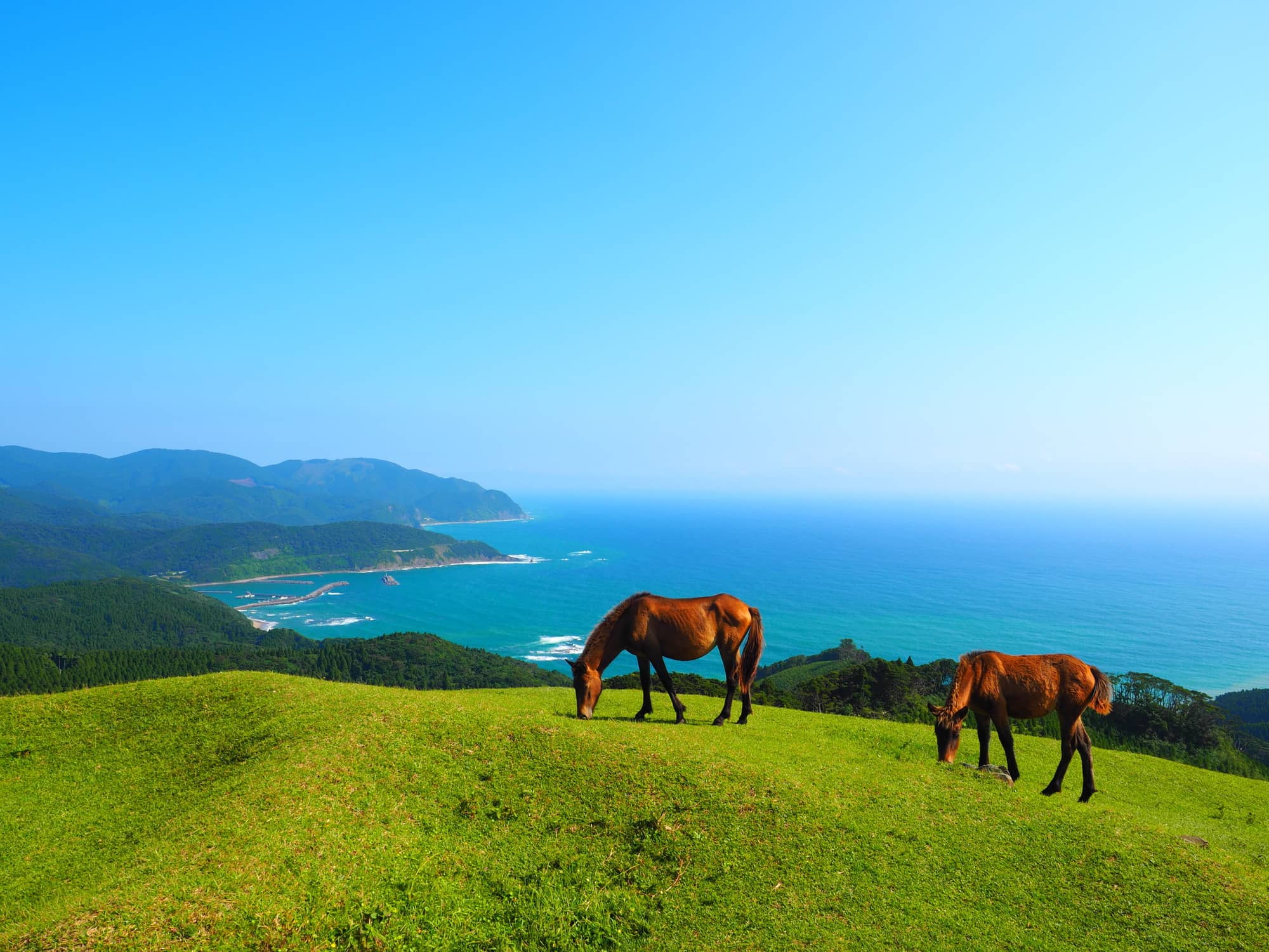 私の最大の「推しポイント」は、何と言っても串間市の最南端に突き出た「都井岬(といみさき)」です。 ここは、国の天然記念物に指定されている野生馬「御崎馬(みさきうま)」が棲息する、日本全国を見渡しても類を見ない特別な場所。柵など一切ない、なだらかな緑の丘陵地を、約100頭の馬たちが家族単位で自由に草を食み、のんびりと暮らしています。